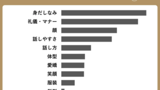 男性の1位が「顔」なのに対し、女性の1位は圧倒的に「身だしなみ」なんです。女性の約4人に3人が身だしなみを重要視しており、「顔」の2倍以上のスコア。男性は女性の「顔」や「愛嬌」に目が行きがちですが、女性はそれよりも男性の「身だしなみ」や「礼儀・マナー」をしっかり見ている、ということがわかります。これは、僕たち男性が特に意識すべきポイントかもしれませんね。