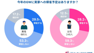 まず、今年のGWの帰省事情について見ていきましょう。調査によると、「帰省する」と答えた人は男女ともに約3割にとどまり、半数以上が「帰省しない」と回答しています。
