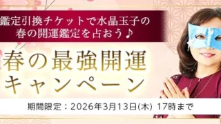 「キャンペーン」という言葉に弱いのは僕だけでしょうか? 今回の『春の最強開運キャンペーン』は、2026年の最強開運日である3月5日にちなんで実施されています。キャンペーン期間中(2026年2月27日(金)~ 2026年3月13日(木)17時まで)、対象の鑑定を1つ占うごとに「鑑定引換チケット」が1つもらえるんです。このチケットはキャンペーン限定の占いに交換できるので、普段よりもお得に、そして深く自分の運勢を見つめ直すことができるでしょう。